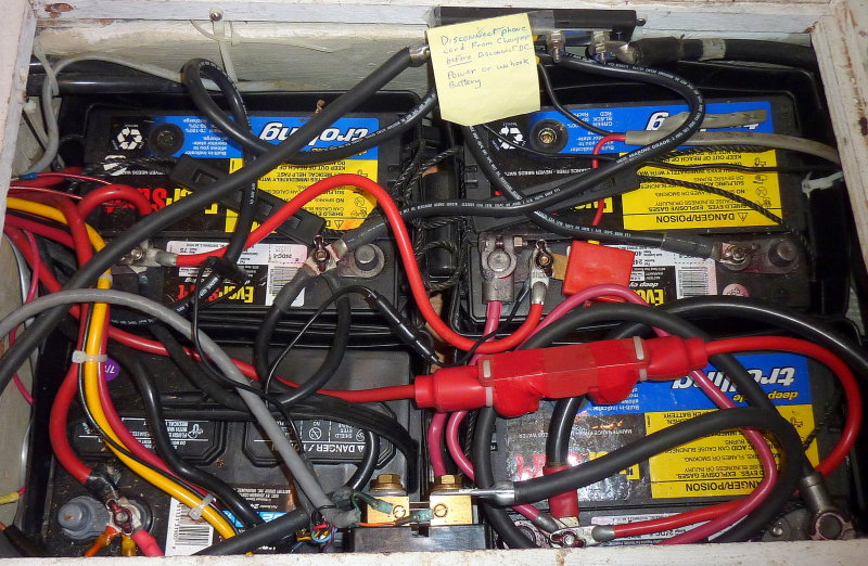 Remember when I said easy? This is it. You run a duplex 14GA wire to the house bank cross-connecting it as shown. Place the negative on one end of the bank and and the fused positive on the other end of the bank. For the start battery voltage a single 14GA wire goes to the B2 terminal.