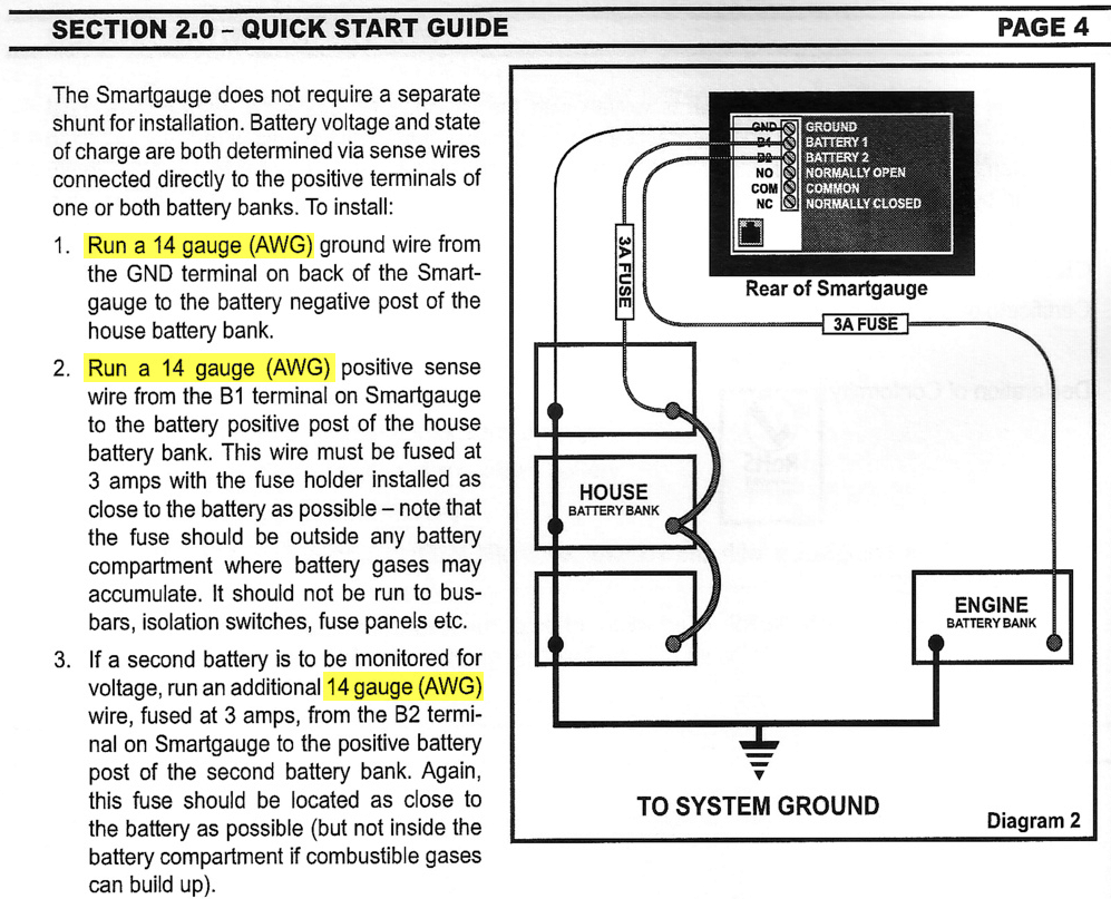 There is a lot of confusion around which size wire to use when installing the Smartgauge. The actual manufacturer states that 18AWG is a bare minimum for wiring the Smartgauge. They also say that bigger is always better and originally indicated to Balmar that 14AWG should be used. As can be seen in the screen shot of the original Smartgauge manual.